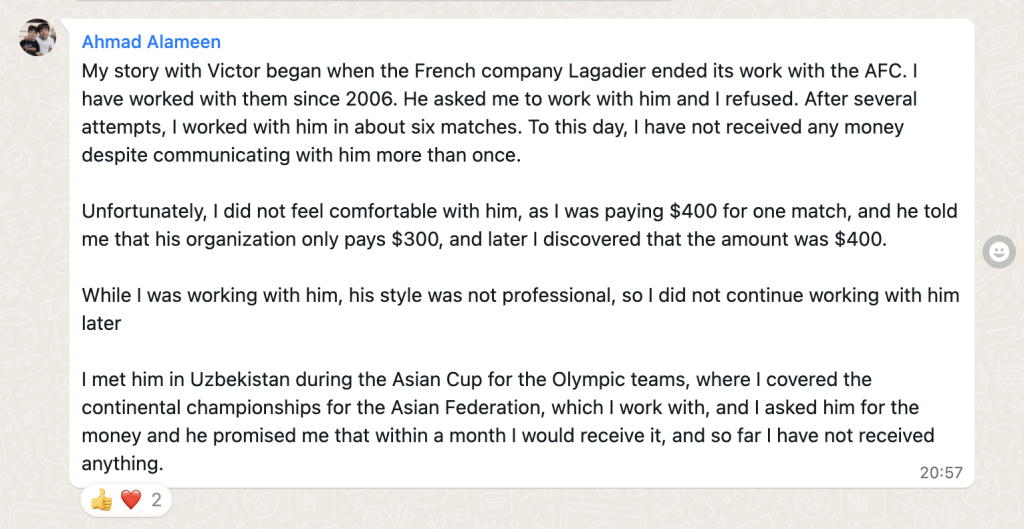 To this day, Ahmad Alameen is owed USD1,800 by Victor Fraile’s current company, Power Sport Images Limited